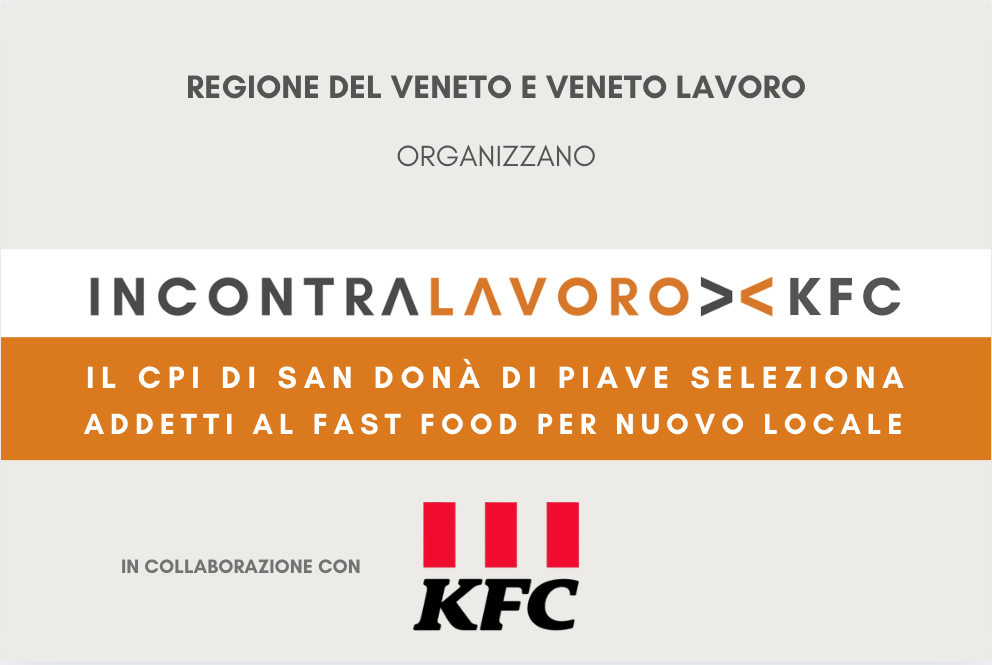 Il Centro per l'impiego di San Donà di Piave (VE) seleziona operatori di fast food per un nuovo ristorante a insegna KFC di prossima apertura nel centro commerciale Centro Piave [...]ÜberIncontraLavoro KFC