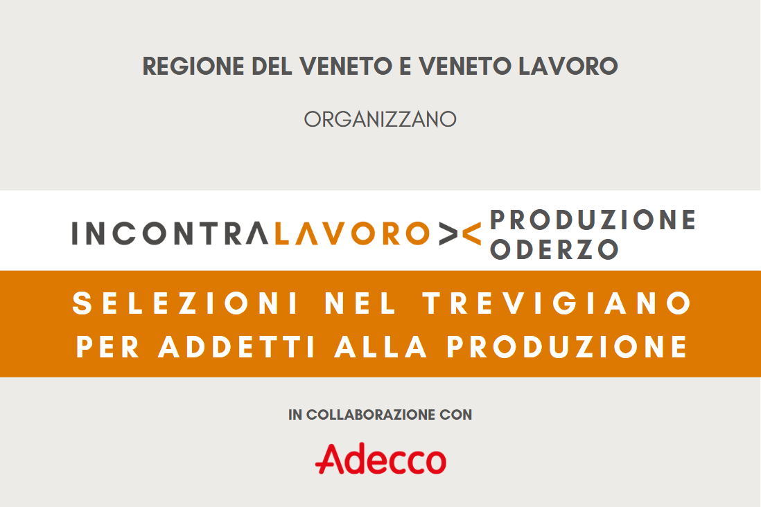 Il Centro per l'impiego di Oderzo organizza un recruiting in collaborazione con Adecco per selezionare addetti alla produzione e al magazzino da impiegare in diverse aziende del territorio [...]ÜberIncontraLavoro Produzione Oderzo