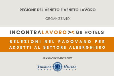 Il Centro per l'impiego di Padova seleziona addetti nel settore turistico-alberghiero da impiegare presso le strutture del gruppo GB Hotels a Abano Terme [...]
